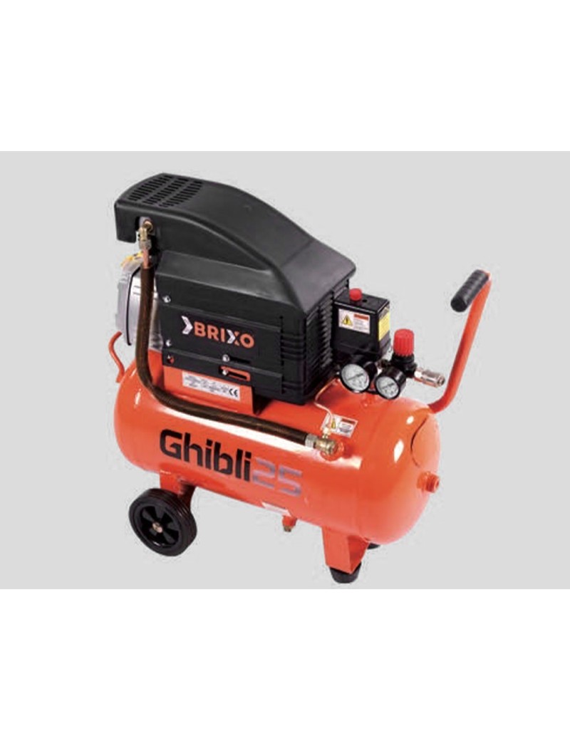 Carrellato, con serbatoio Lt. 25, lubrificato ad olio, funzionamento completamente automatico, comandato dal pressostato, dotato di rubinetto scarico condensa, valvola di sicurezza, manometri, riduttore di pressione. Aspirazione 160 lt/m' potenza hp 2 - 2800 giri/m?, pressione max 8 Bar