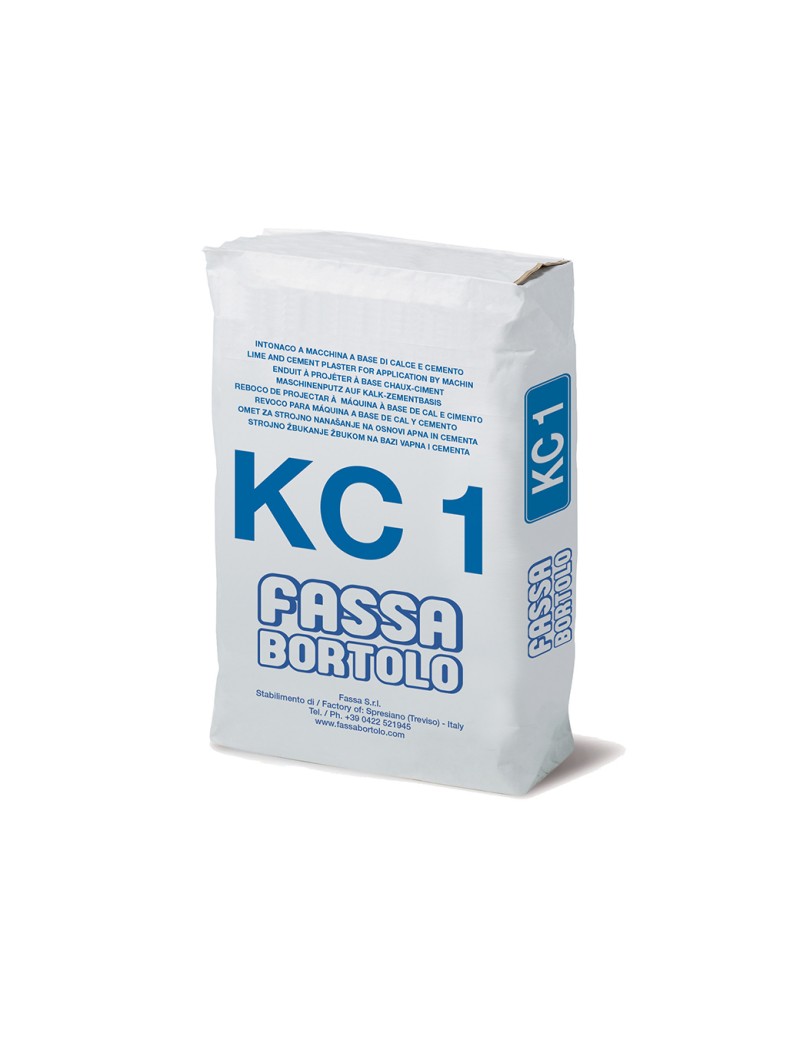 KC 1 viene usato come intonaco di fondo su murature in mattoni, blocchi in calcestruzzo, calcestruzzo grezzo, ecc. Per sottofondi speciali bisogna osservare le istruzioni del fornitore. Preparazione del fondo La muratura deve essere libera da polvere, sporco, efflorescenze saline, ecc. Eventuali tracce di oli, grassi, cere, ecc. devono essere preventivamente rimosse. Le superfici in calcestruzzo liscio devono essere asciutte e precedentemente trattate con materiali aggrappanti come ad esempio SP 22. Giunti di elementi diversi devono essere armati con una speciale rete in fibra di vetro alcali-resistente; la rete non deve essere attaccata direttamente alla muratura, ma va immersa nella parte superficiale dell'intonaco. Per ottenere una buona qualità degli intonaci ed evitare eccessivi consumi di materiale è consigliabile riservare una particolare cura all'esecuzione delle murature; le fughe tra i mattoni devono essere ben riempite, eventuali fori o spaccature nella muratura devono essere precedentemente chiusi, i controtelai devono sporgere di pochi millimetri. Per rispettare la piombatura delle pareti è consigliabile predisporre paraspigoli o stagge negli angoli e guide verticali nelle pareti. Lavorazione KC 1 si lavora con macchine intonacatrici tipo FASSA, PFT, PUTZKNECHT, PUTZMEISTER, TURBOSOL o simili. Si applica in unico strato sino a spessori di 20 mm spruzzando dal basso verso l'alto e, successivamente, si raddrizza con staggia ad H o a coltello con passaggi in senso orizzontale e verticale sino ad ottenere una superficie piana. Per spessori superiori a 20 mm l'intonaco deve essere applicato in più strati successivi, a distanza di almeno 1 giorno, avendo sempre l'accortezza di irruvidire lo strato di supporto. La malta, dopo la miscelazione con acqua, deve essere applicata entro due ore. La lavorazione superficiale dell'intonaco (frattazzatura, grattatura, ecc.) si effettua da 1,5 a 4 ore dopo l'applicazione a seconda delle condizioni ambientali e del tipo di superficie. Per applicazioni esterne, al fine di ottenere una superficie omogenea e compatta idonea a supportare finiture tipo rivestimenti a spessore, si consiglia di rifinire l'intonaco con frattazzo di plastica o legno; nel caso di tinteggiatura delle superfici è consigliabile l'utilizzo dell'intonaco di finitura IP 10 disponibile nella granulometria da 1 mm. Nei locali interni la finitura delle pareti si completa applicando, quando l'intonaco è completamente indurito, lisciature, rivestimenti murali a base minerale, ecc. Una finitura più rustica può essere ottenuta rifinendo direttamente il materiale con frattazzo di plastica, spugna o legno.