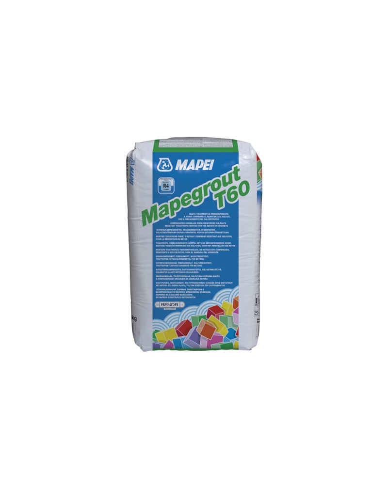 Malta tissotropica fibrorinforzata a ritiro compensato resistente ai solfati per il risanamento del calcestruzzo. DATI TECNICI: Dimensione massima dell’aggregato: 2,5 mm. Rapporto dell’impasto: 100 parti di MAPEGROUT T60 con 16,5-17,5 parti di acqua e 0,25% di MAPECURE SRA. Durata dell’impasto: circa 1 h (a +20°C). Spessore minimo di applicazione: 1 cm. Spessore massimo di applicazione: 5 cm per strato in verticale e 2 cm per strato a plafone. Classificazione: EN 1504-3 - malta strutturale di classe R4. Immagazzinaggio: 12 mesi. Applicazione: spatola, cazzuola o macchina intonacatrice. Consumo: 18,5 kg/m² per cm di spessore. Confezioni: sacchi in polietilene sottovuoto da 25 kg.