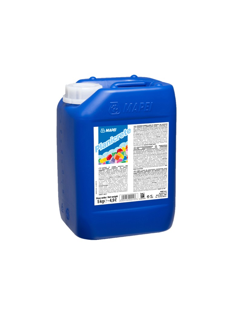 PLANICRETE KG 5 LATTICE PRIMER CEMENTIZIO MAPEI Lattice di gomma sintetica per migliorare l’adesione e le prestazioni di impasti cementizi e per la preparazione di boiacche di adesione per massetti. DATI TECNICI: Consistenza: liquido fluido. Residuo solido: 36%. Immagazzinaggio: 24 mesi. Consumo: – per preparare boiacche adesive: 100-150 g/m²; – per preparare massetti ed intonaci: 50-80 kg/m³. Confezioni: taniche da 5, 10, 25 kg e confezioni da 12 x 1 kg.