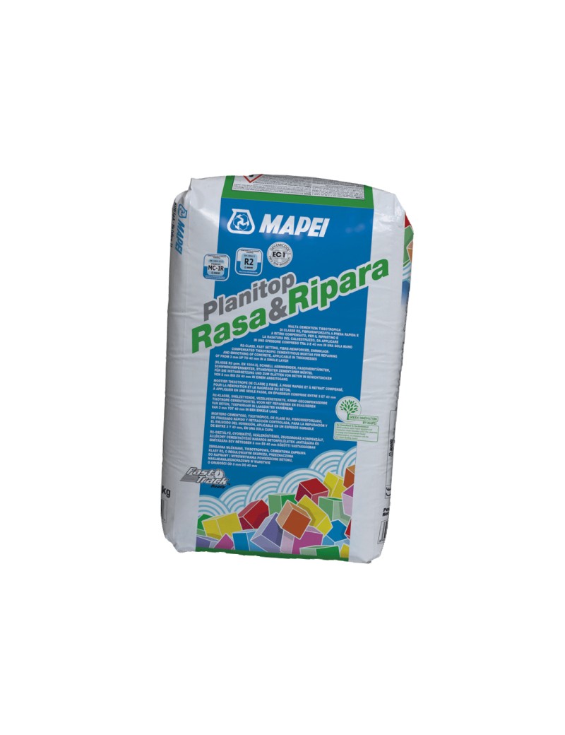 Malta cementizia tissotropica di classe R2, fibrorinforzata a presa rapida e a ritiro compensato, per il ripristino e la rasatura del calcestruzzo, da applicare in uno spessore compreso tra 3 e 40 mm, in una sola mano. DATI TECNICI: Dimensione massima dell’aggregato: 0,4 mm. Rapporto dell’impasto: 100 parti di PLANITOP RASA & RIPARA con 17-19 parti di acqua. Durata dell’impasto: circa 15 min. ad una temperatura compresa tra +10°C e +25°C. La durata dell’impasto può essere prolungata di 15-20 min. con l’aggiunta dell’additivo ritardante MAPETARD ES (1 flacone da 0,25 kg per ogni sacco da 25 kg di PLANITOP RASA & RIPARA). Spessore minimo di applicazione: 3 mm. Spessore massimo di applicazione: 4 cm per strato. Classificazione: EN 1504-3 - malta non strutturale di classe R2 EN 1504-2 - rivestimento (C) principi MC e IR. EMICODE: EC1 Plus - a bassissima emissione. Immagazzinaggio: 12 mesi. Applicazione: spatola o cazzuola. Consumo: circa 15 kg/m² per cm di spessore. Confezioni: sacchi in polietilene sottovuoto da 25 kg; scatole da 20 kg (4 sacchetti da 5 kg).