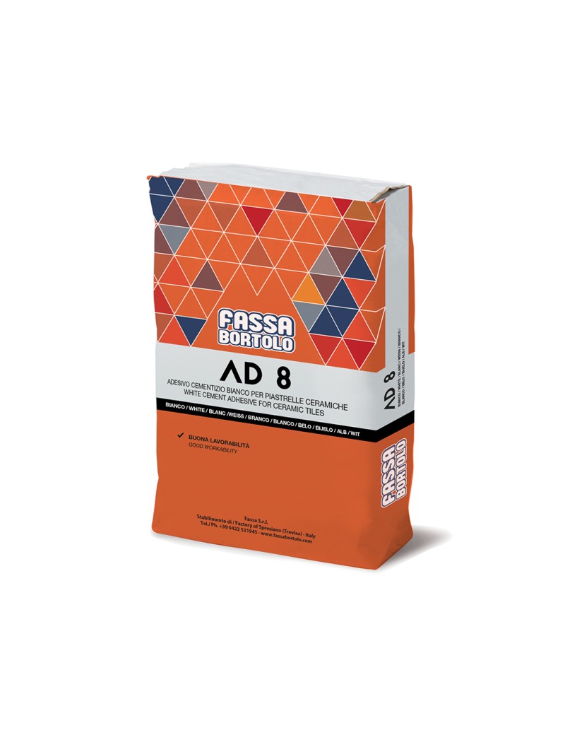 Impiego AD 8 viene usato per incollare piastrelle in ceramica, mosaico ceramico, klinker, gres, cotto, ecc. su intonaci di fondo a base di calce, cemento, gesso e malte bastarde, massetti a base cemento o anidrite ben stagionati ed asciutti, solette in calcestruzzo ben stagionate ed esenti da freccia.