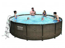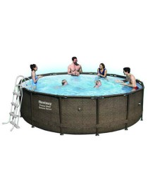 PISCINA Ø 427H107 TONDA CON TELAIO RATTAN la piscina ideale per un giardino o per un mattonato , comprende scaletta per accesso sicuro e comodo, filro con pompe filtro per pulire l'acqua e ritardare la stratificazione del deposito. Telo copertura non incluso. Associa l'acquisto con il kit per l'avvio della piscina!
