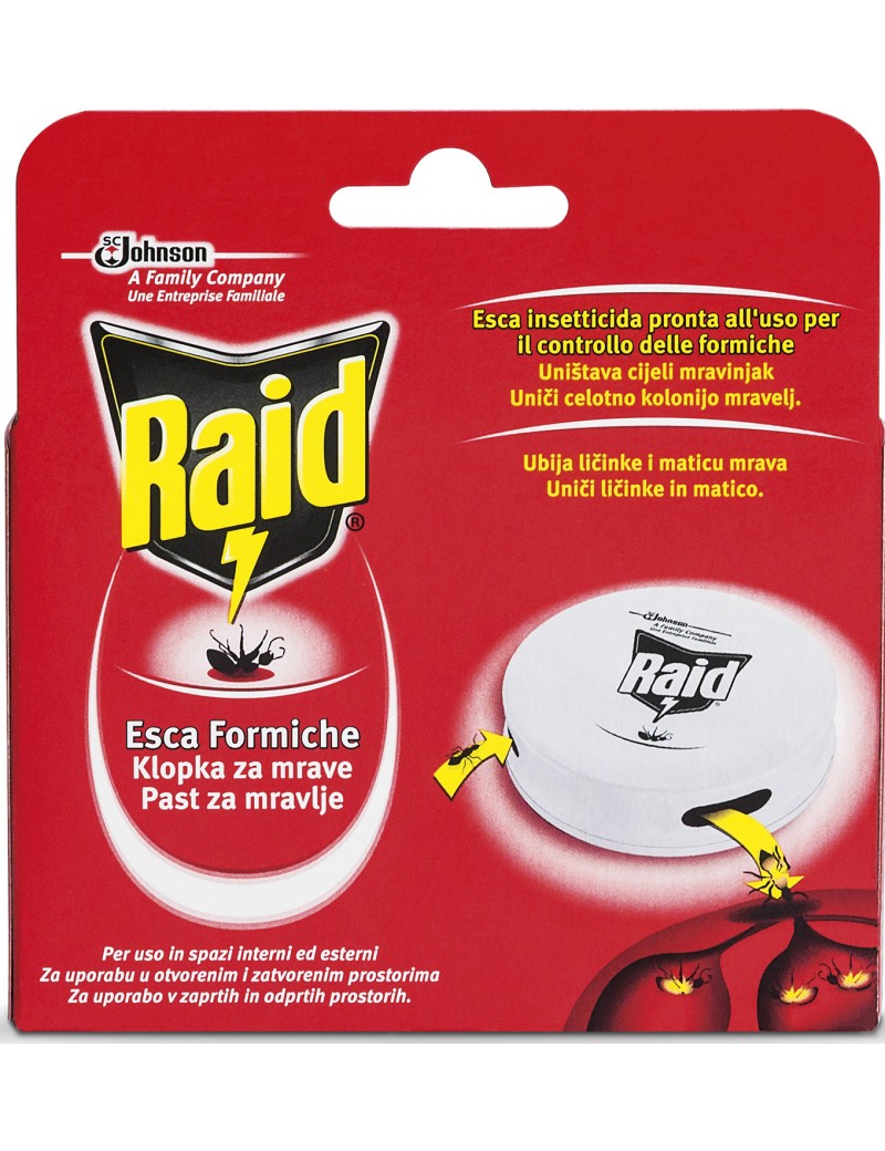 Raid Esca Formiche è un’esca pronta all’uso per il controllo delle formiche indicata per la disinfestazione di case d’abitazione, balconi e terrazze, cinema, scuole, musei, ospedali, caserme, ristoranti, alberghi, campeggi, treni, navi, aerei, magazzini, industrie in genere, industrie e laboratori alimentari. L’esca contiene un supporto impregnato.