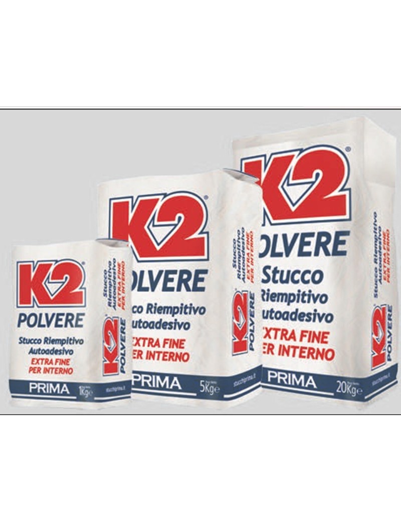 K2 POLVERE è uno stucco bianco, extra fine, composto da gesso superventilato, inerti e resine accuratamente selezionate che permettono di ottenere un prodotto di alta qualità. è ideale per rasare spessori finissimi, ottenendo rasature altamente qualitative. Ideale per preparare supporti interni prima della verniciatura e/o dell’applicazione di decorativi in gesso e carte da parati. Ideale per eliminare e stuccare piccole imperfezioni su pareti murali e per ripristinare vecchie pareti.
