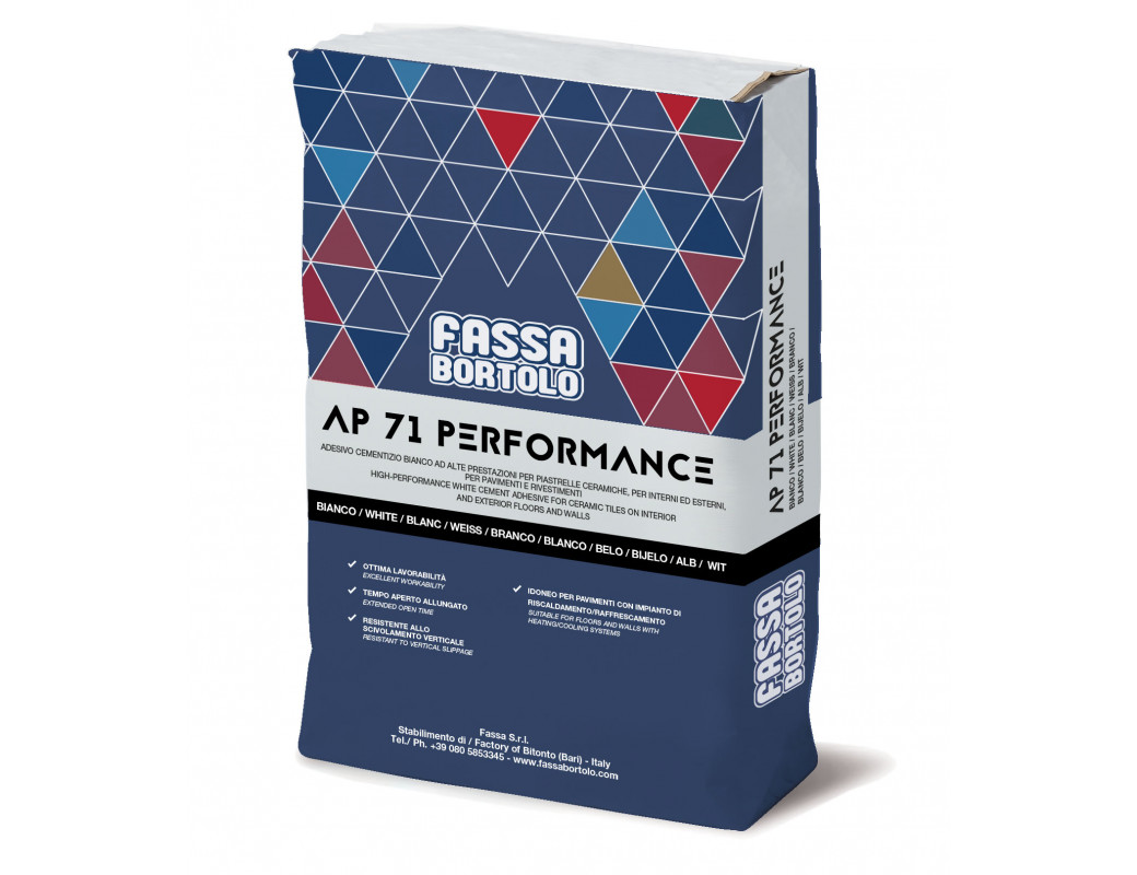 AP 71 PERFORMANCE, grazie alla sua formulazione, è particolarmente indicato per la posa, sia in interno che in esterno, su pareti e pavimenti, di piastrelle in ceramica, mosaico ceramico, klinker, gres, gres porcellanato, cotto e pietre naturali non sensibili alla macchiatura e stabili all'umidità. Idoneo per la posa di formati fino a 3600 cm2 con lato maggiore inferiore a 90 cm.