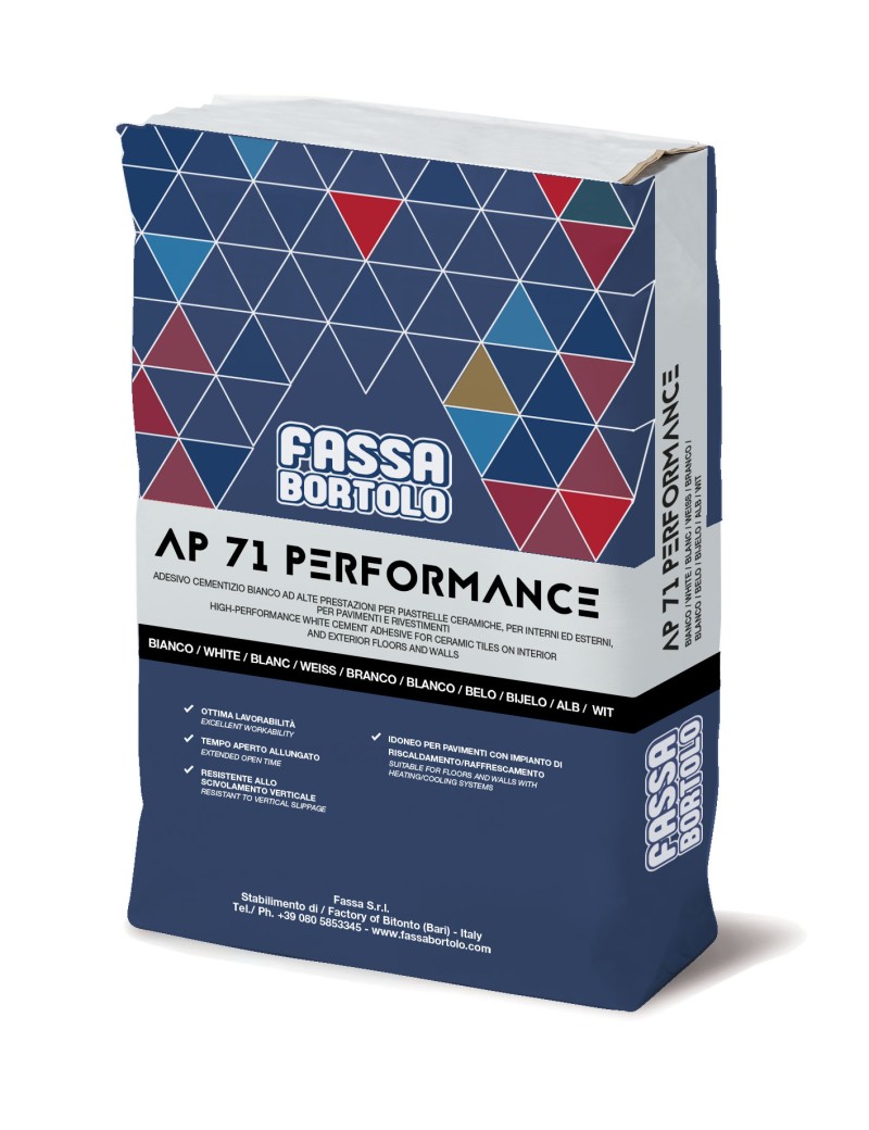 AP 71 PERFORMANCE, grazie alla sua formulazione, è particolarmente indicato per la posa, sia in interno che in esterno, su pareti e pavimenti, di piastrelle in ceramica, mosaico ceramico, klinker, gres, gres porcellanato, cotto e pietre naturali non sensibili alla macchiatura e stabili all'umidità. Idoneo per la posa di formati fino a 3600 cm2 con lato maggiore inferiore a 90 cm.