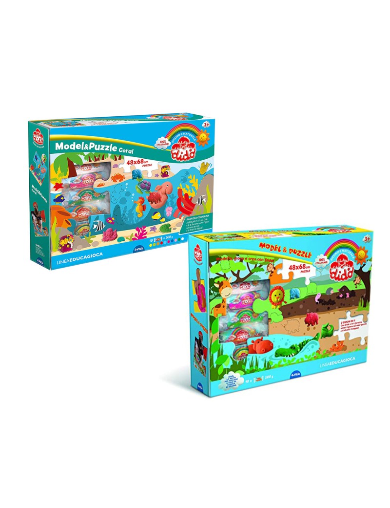 Didò model puzzle, un gioco che ne vale due. Questa confezione propone due giochi in uno. Un maxi-puzzle da comporre e su cui giocare, dopo aver posizionato sul puzzle nelle zone tratteggiate gli animali modellati con le formine didò.
